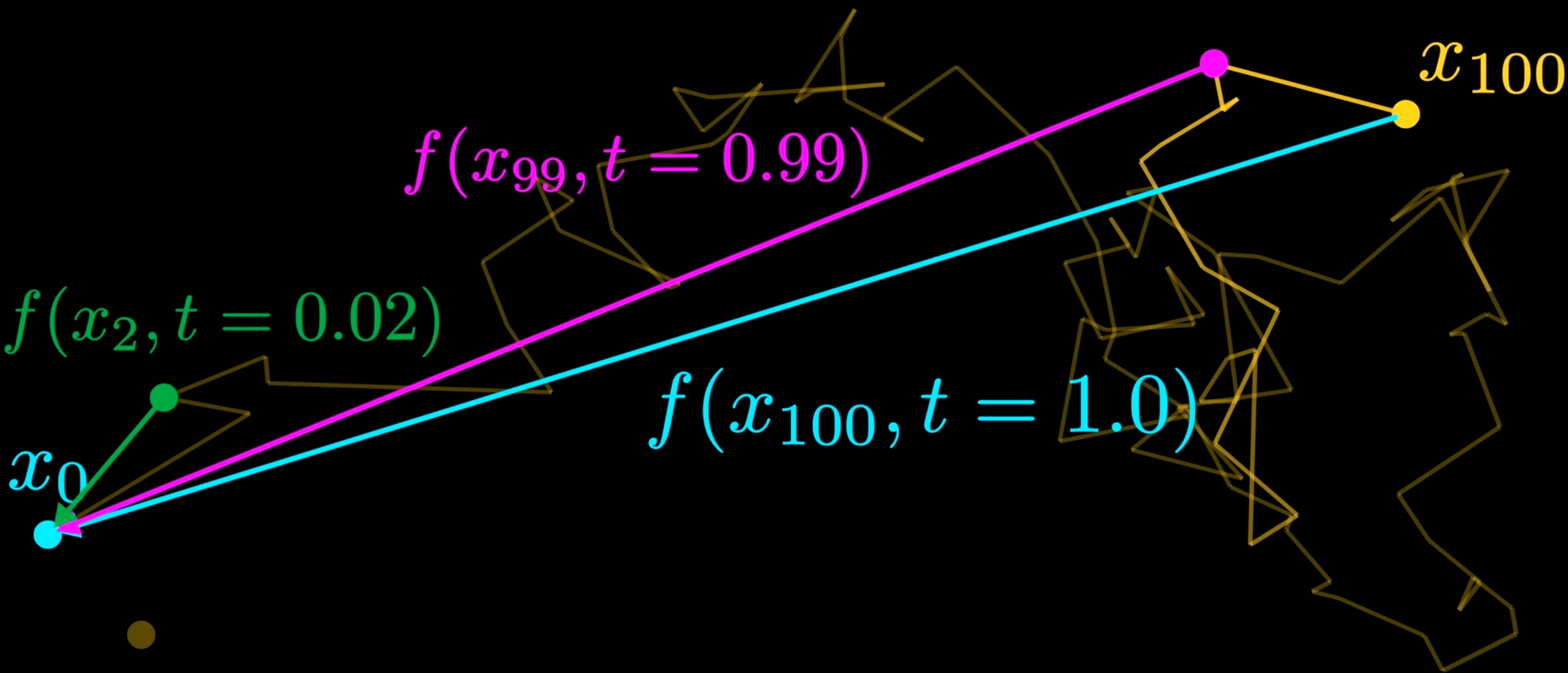 - 为了学到这个梯度场, 用已知有意义的图片不断加噪声 (相当于该图片点在 Image Space 上做 Brownian Motion), 然后设计一个神经网络来逐步 (“One-step”) 学习反过来的过程 Figure 2 . 但这在统计意义上相当于直接用起点和终点来训练 (Figure 3), 用起始点而不用中间点来训练的好处是降低了训练数据的 Variance 的影响.
