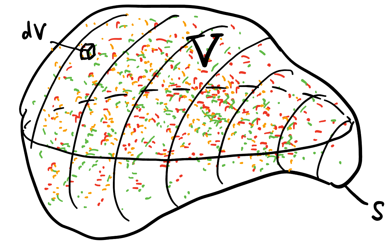 The charges in the real world are not commonly appears like an infinitesimal point. They distributed evenly through a body instead of concentrate on a point of no size. Therefore, \(Q_{\text{in}}\) on the RHS9 of Equation 6 could be write as an integral: \[ \frac{Q_{\text{in}}}{\epsilon_0} = \iiint_V \frac{\rho}{\epsilon_0} \mathrm{d}V, \] where \(V\) is the region enclosed by \(S\), \(\rho\) is the density10 of charges at some place inside \(S\).