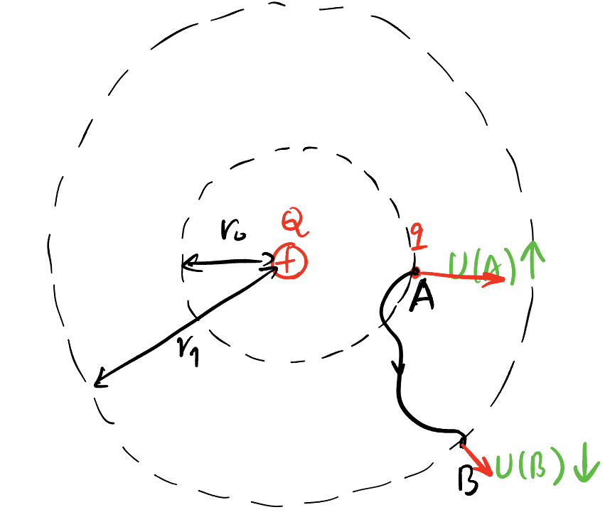 Let’s consider the work done when we fix \(Q\) and gradually move \(q\) in a certain path. Since the force from \(Q\) to \(q\) is always radially from \(Q\), it turns out that the work done only depends on the initial and final position of \(q\) regardless of the moving process in between! We say a force like this Conservative3. We would like to think that there is a number \(U\) attached at every spatial point around \(Q\) such that the the work done from point \(A\) and \(B\) is just that \(U(A)-U(B)\)4, i.e., \[ W_{AB} =: U(A) - U(B). \]