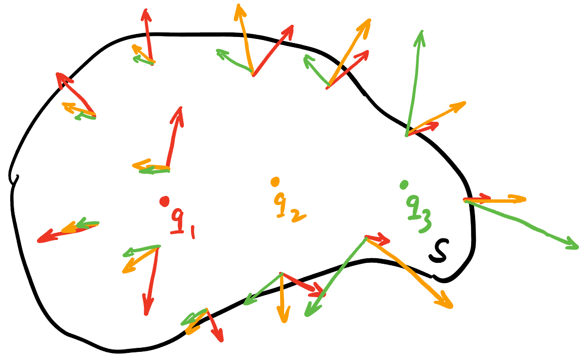 Suppose there are \(N=3\) point charges inside \(S\) as shown in Figure 3, the total flux is