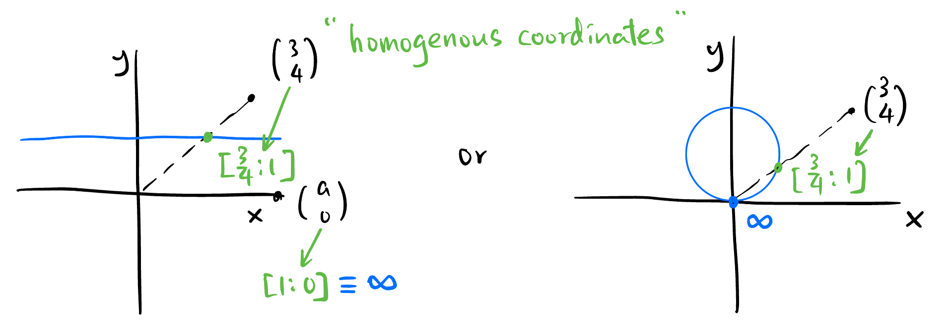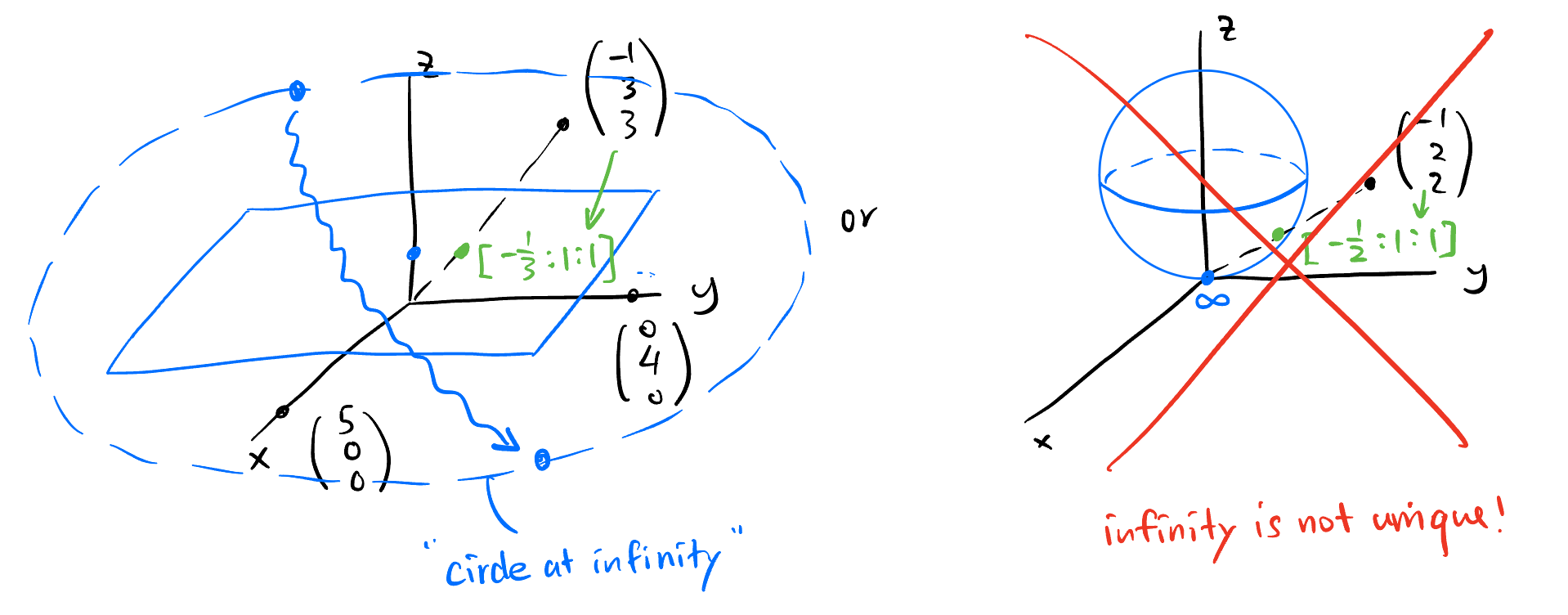 The lines in the \(xy\) plane in Figure 7 do not intersect the blue plane. We thus define them to “intersect with the circle at infinity”. The right figure of Figure 7 is NOT true since there is only one infinity, so it cannot tell the difference of the lines in the \(xy\) plane. So notably, \[ \begin{aligned} \mathbb{RP}^2 &\simeq \mathbb{R}^2 \cup \{\text{circle at infinity}\} \\ &\not\simeq \mathbb{R}^2 \cup \{\infty\}. \end{aligned} \]