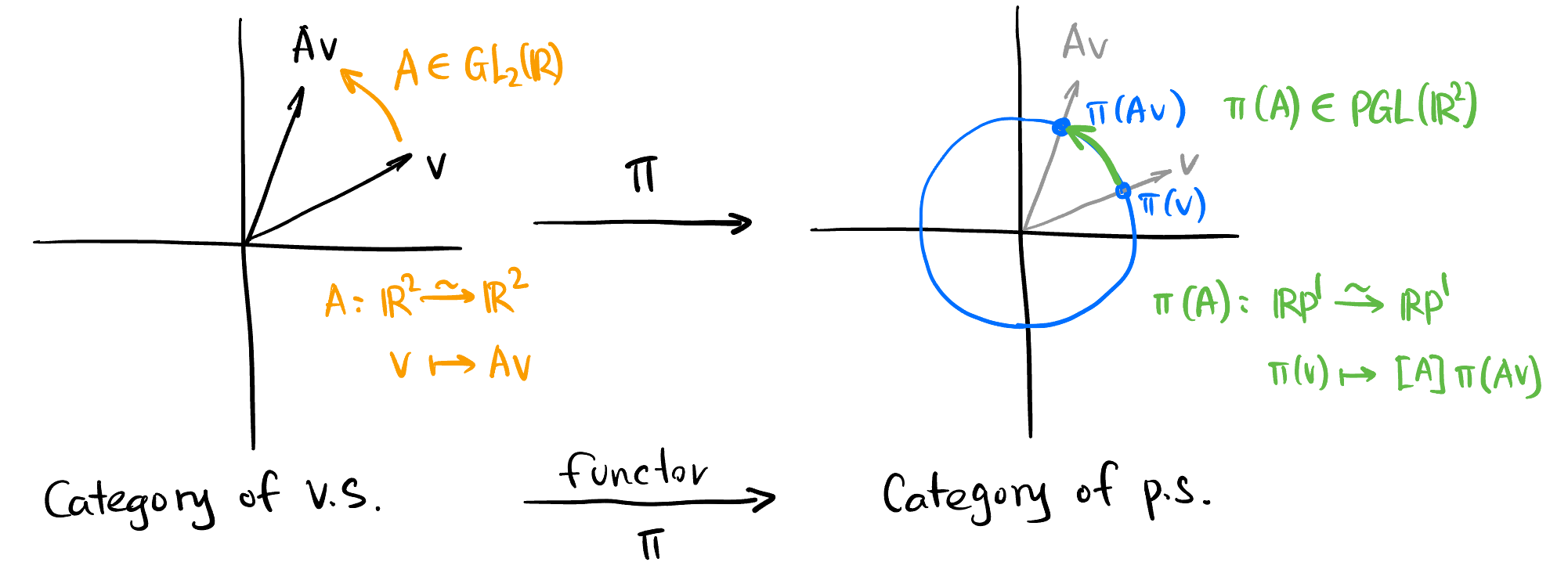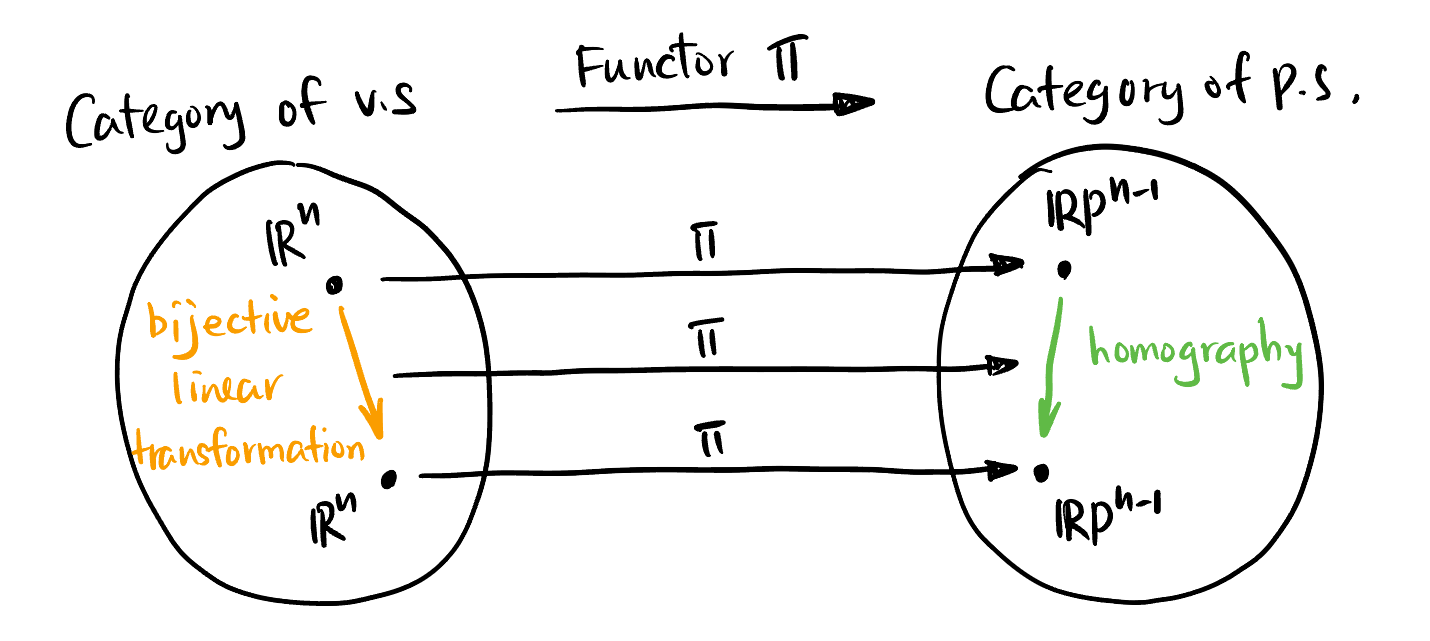 The canonical projection \(\pi\) in Section 1.3 not only project vector spaces but also the linear transformations between vector spaces. So it could be viewed as a functor from the category of vector spaces (v.s.) to the category of projective spaces (p.s.):