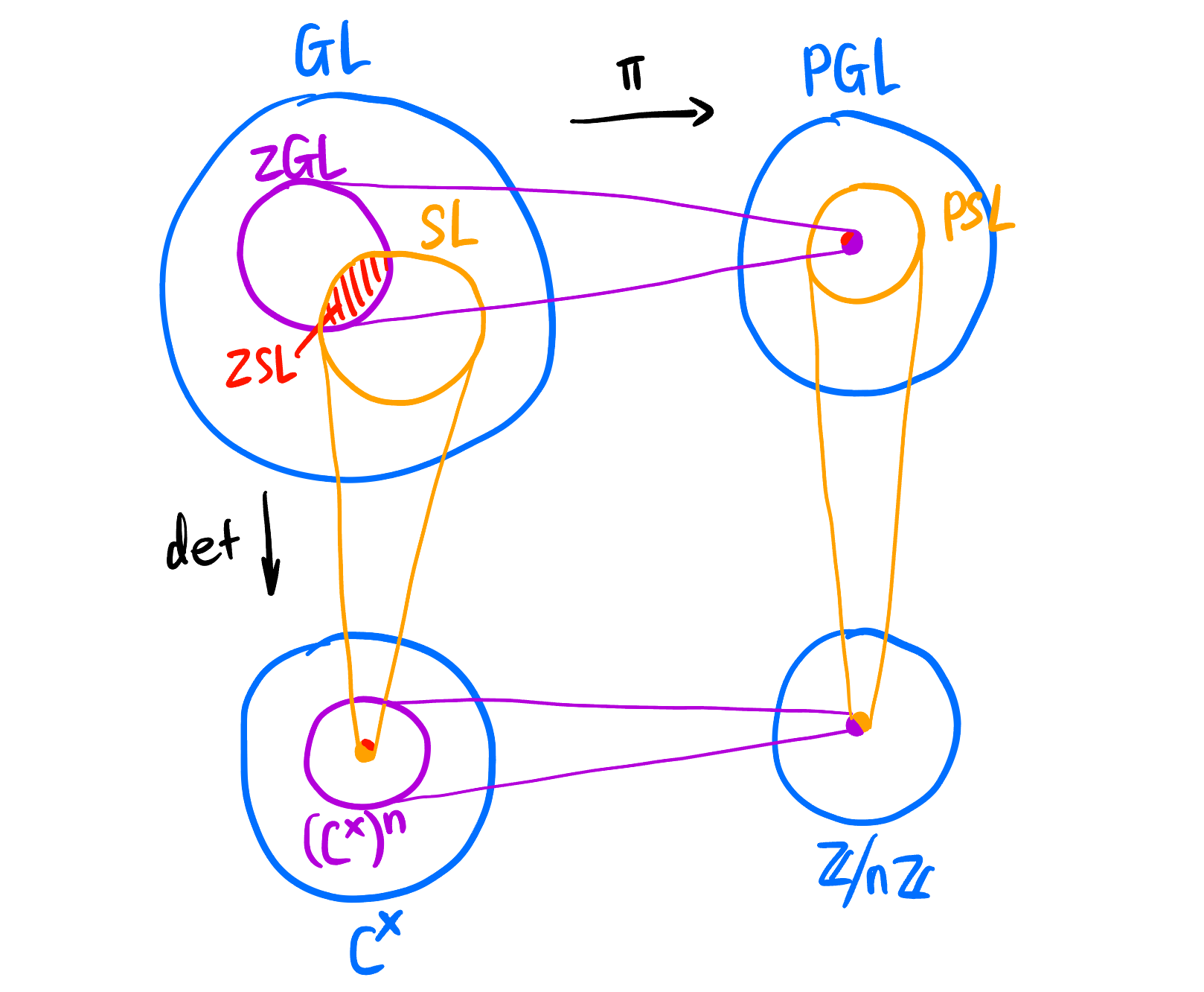 We know from this post that for any group \(G\), \[ 1 \xrightarrow[]{} Z(G) \hookrightarrow G \twoheadrightarrow \operatorname{Inn}(G) \xrightarrow[]{} 1, \] where \(\text{Inn}(G)\) = \(G/{Z(G)}\). Let \(G = \text{GL}(V)\), then we have: \[ 1 \xrightarrow[]{} \text{ZGL}(V) \hookrightarrow \text{GL}(V) \twoheadrightarrow \operatorname{PGL}(V) \xrightarrow[]{} 1, \] where \[ \text{Inn}(\text{GL}(V)) = \frac{\text{GL}(V)}{\text{ZGL}(V)} = \text{PGL}(V) \]