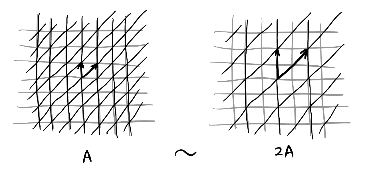 It’s obvious that some linear transformations are equivalent when we view them projectively. For example in Figure 14, a matrix \(A \in \text{GL}(\mathbb{R}^2)\) looks the same as its scalar multiples \(kA\) for \(k \in \mathbb{R}^*\) under the functor \(\pi\):