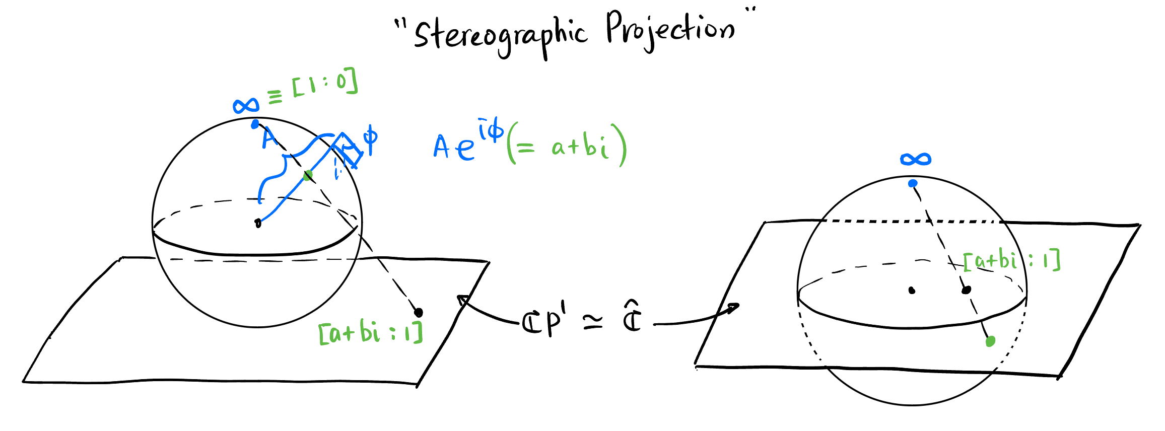 Therefore, we would need one complex number plus only one extra symbol \(\infty\) (together called the projectively extended complex number \(\mathbb{\hat{C}}\)) to specify an element in \(\mathbb{CP}^1\): \[ \mathbb{CP}^1 \simeq \mathbb{C} \cup \{\infty\} \equiv \mathbb{\hat{C}}. \]