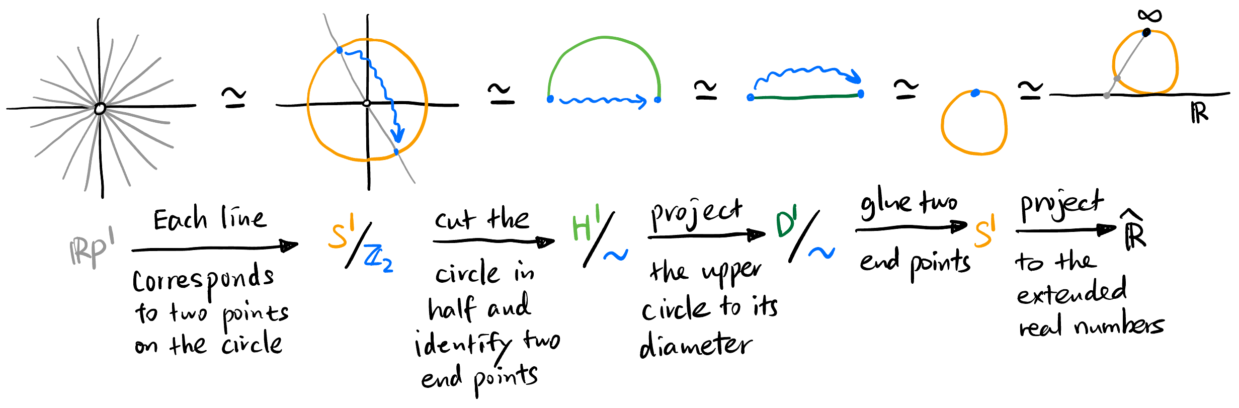 Instead of let a line intersects the unit circle at the origin (as shown in the first isomorphism in Equation 2), there are different graphical representations of \(\mathbb{RP}^1\):