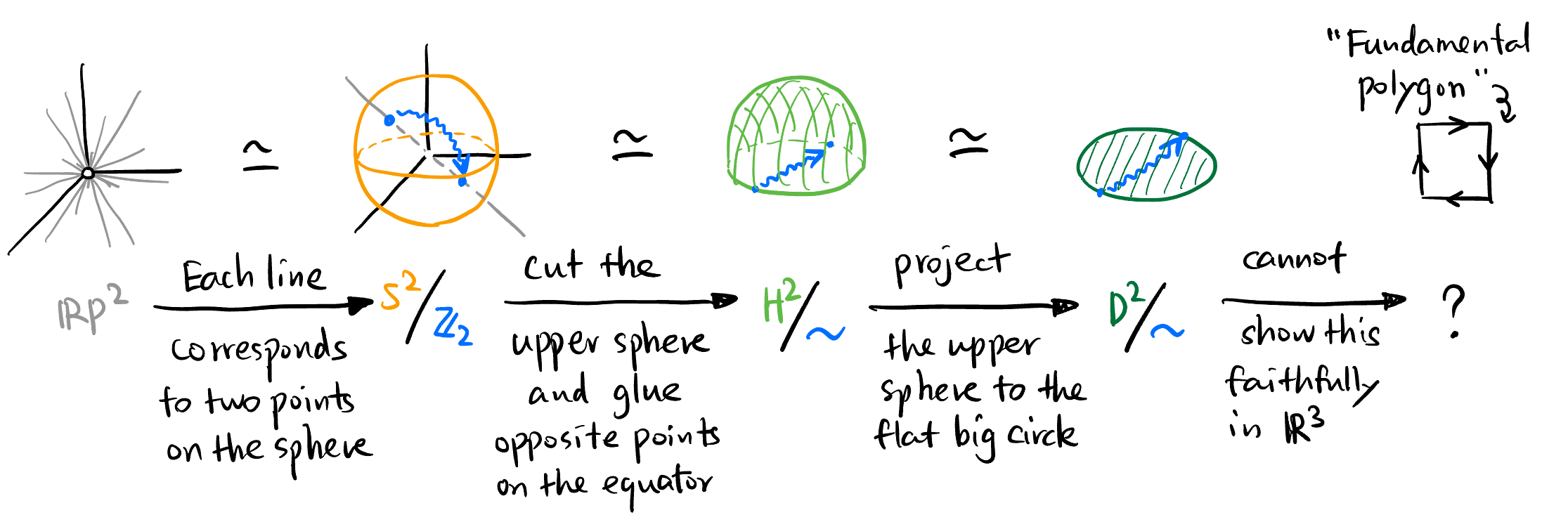 Let \(V = \mathbb{R}^3\), then: \[ \mathbb{RP}^2 \simeq \frac{\mathbb{S}^2}{\mathbb{Z}_2} \simeq \frac{H^2}{\sim} \simeq \frac{D^2}{\sim}. \tag{3}\]