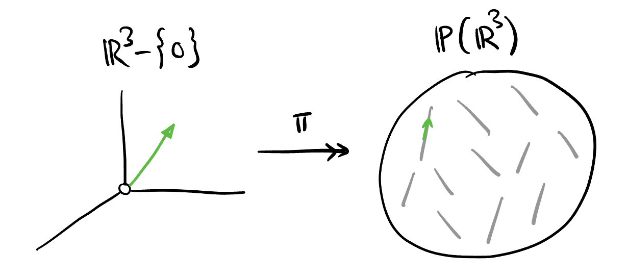 There is a (surjective) canonical projection \[ \begin{aligned} \pi: V - \{0_V\} &\twoheadrightarrow \mathbb{P}(V) \\ x &\mapsto [x]_{\sim} \end{aligned} \] that maps each non-zero vector to its equivalence class (as shown in Figure 2).