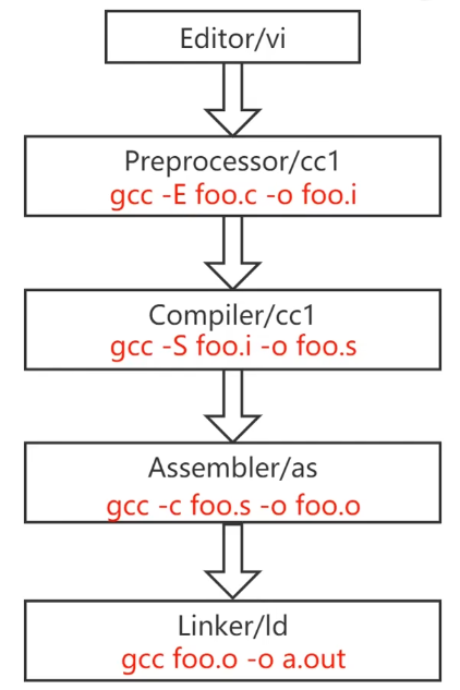-E: 只预处理, 不编译.-S: 生成汇编代码 (.s文件)-c: 只编译, 不链接. (生成.o文件)-o <file>: 指定输出文件名.-g: 在输出的文件中加入支持调试的信息.-v(verbose): 显示编译过程中的详细信息.