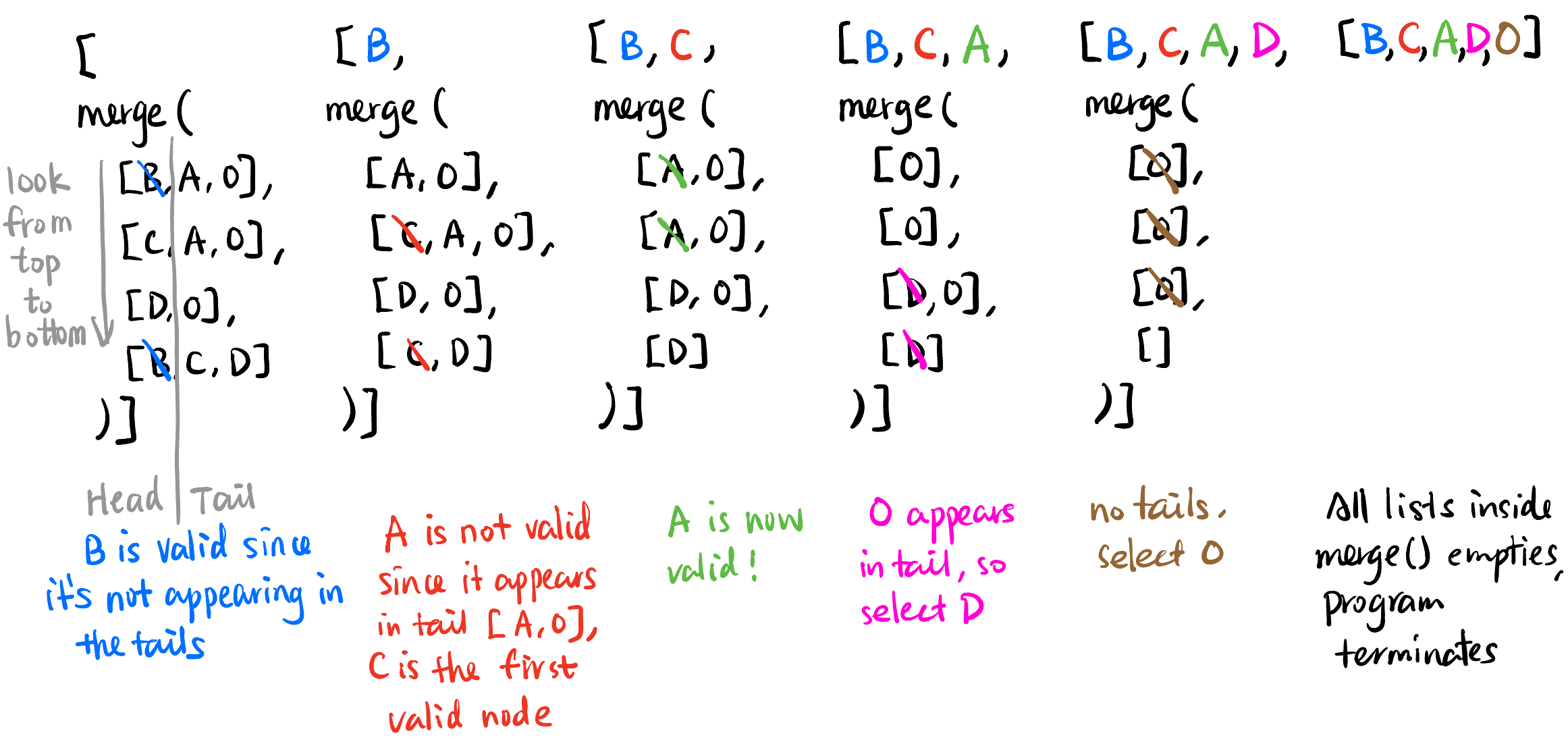 - valid 的定义是: 该节点不在任何其它 list 的 tail 中出现 (这一步的原因是比如 \(A\) 在 tail 中出现了, 说明 \(A\) 前面肯定还有它的父类没有被选中, 不能选 \(A\)).