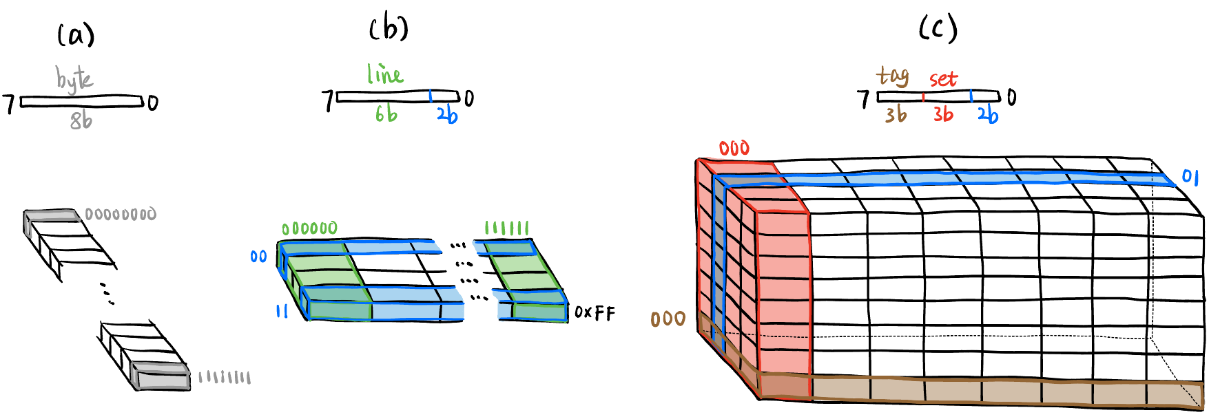- Way: 由于 Cache 容量有限 (即 Figure fig-cache-miss 中 Cache 的高度肯定小于 RAM 的高度), 在 Cache 中我们将 tag 附加在 $Line 里, 纵坐标起名为 way (Figure fig-cache-miss 中有 2 个 way).