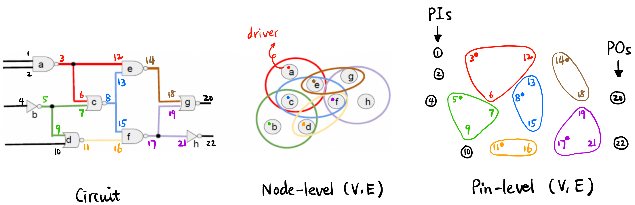 Hypergraph 超图: 图的一种推广, Netlist 常被建模成 (Directed [1]) hypergraph \((V, E)\) (edge 可以有多个 vertex). 一般有 Node-level 和 Pin-level 两种定义方式: