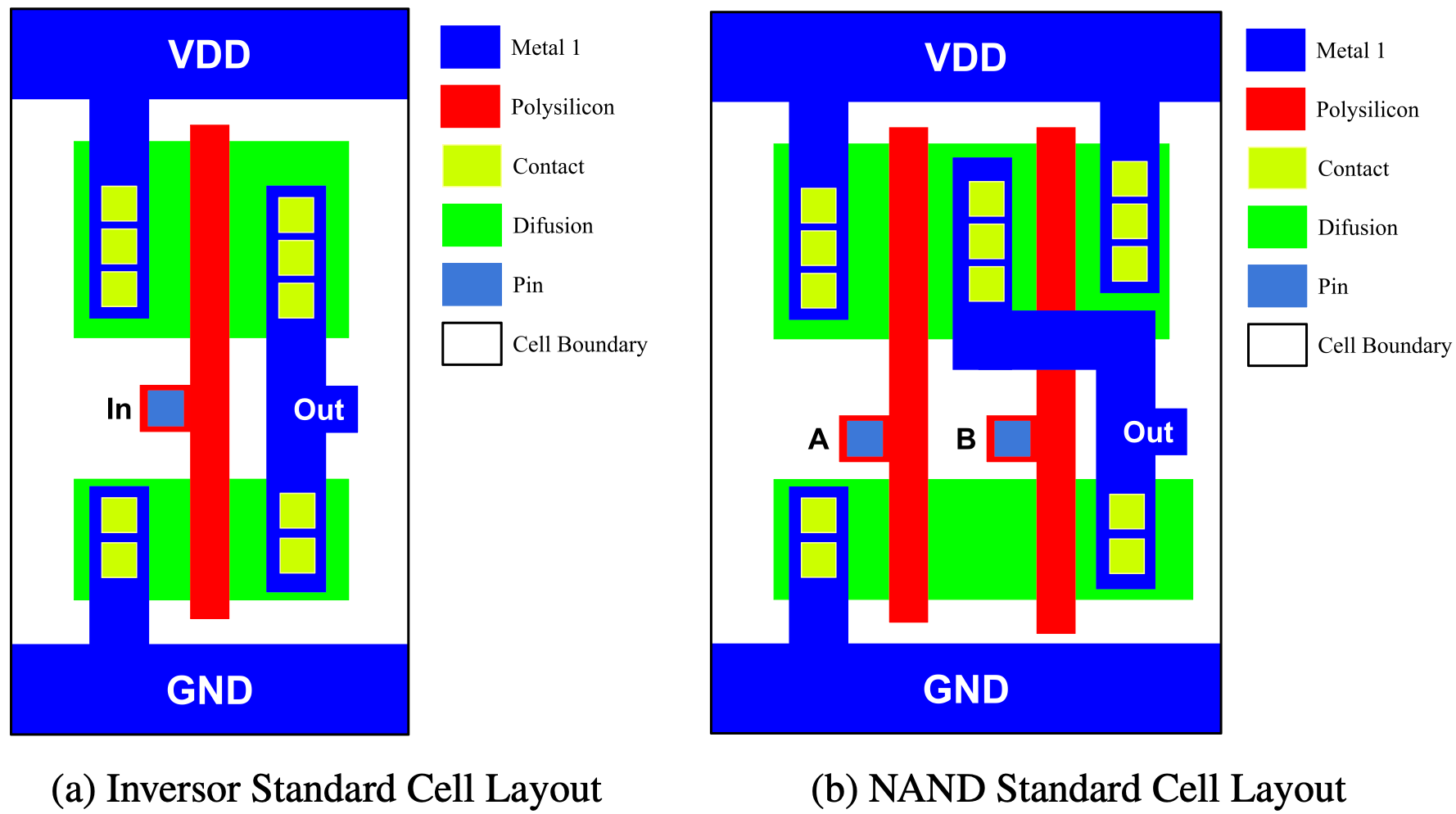 Standard Cell (std cell) 标准单元: 一组实现逻辑门的物理单元 (AND, OR, NOT, NAND, etc.) [5]. 他们过于基础以至于被称为 “standard”.