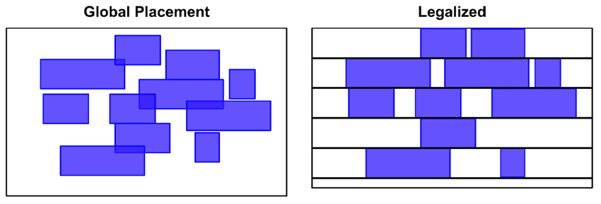 - Legalization 合法化: 消除重叠和在两个方向对齐的过程 (见 Figure fig-legalization). Cell/macro 不能随便放置, 而要在两个方向对齐: