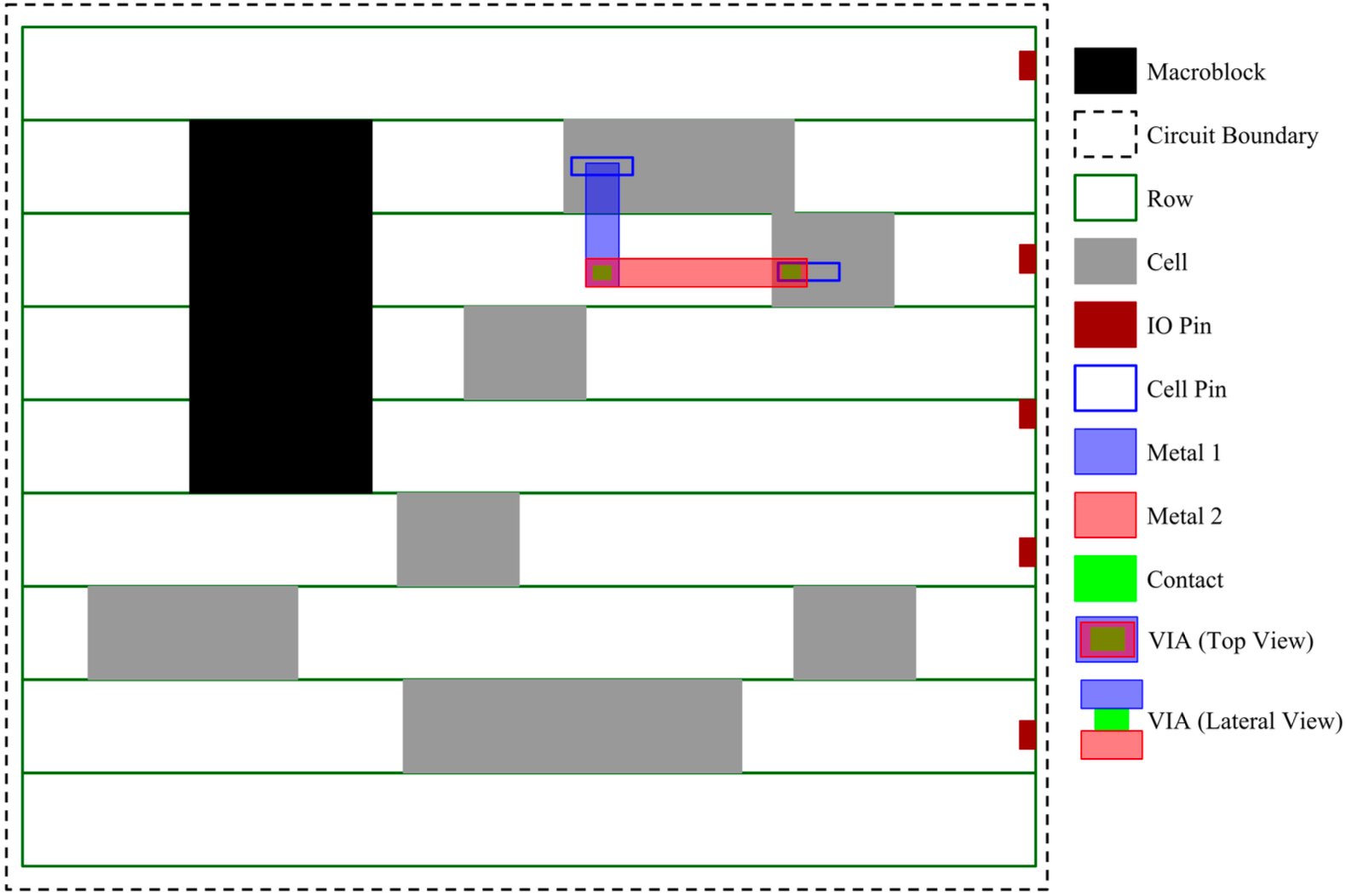 - Row: 见 Figure fig-layout, 每个 std cell 的上下为该 cell 的供电 metal (上 VDD 下 GND), 我们希望每个 std cell 的这两个 metal 共线, 这样才方便提供统一的供电. 自然的, 所有 cell/macro 要在水平方向成一条线, 使得 die 有“一层一层”的概念, 每一层称为一个 row. Row height 等于 std cell height; Row 分隔线 (见 Figure fig-sitedemo 的蓝色条) VDD 和 GND 交替.