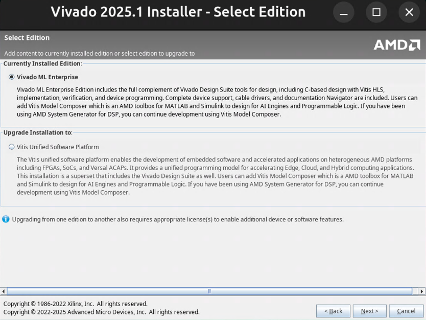upgrade 的时候要选择 Vitis Unified Software Platform!! 安装完成后, 会发现 Vitis 2025.1 GUI (Figure fig-vitis-gui) 打不开, 我们需要换这个库: