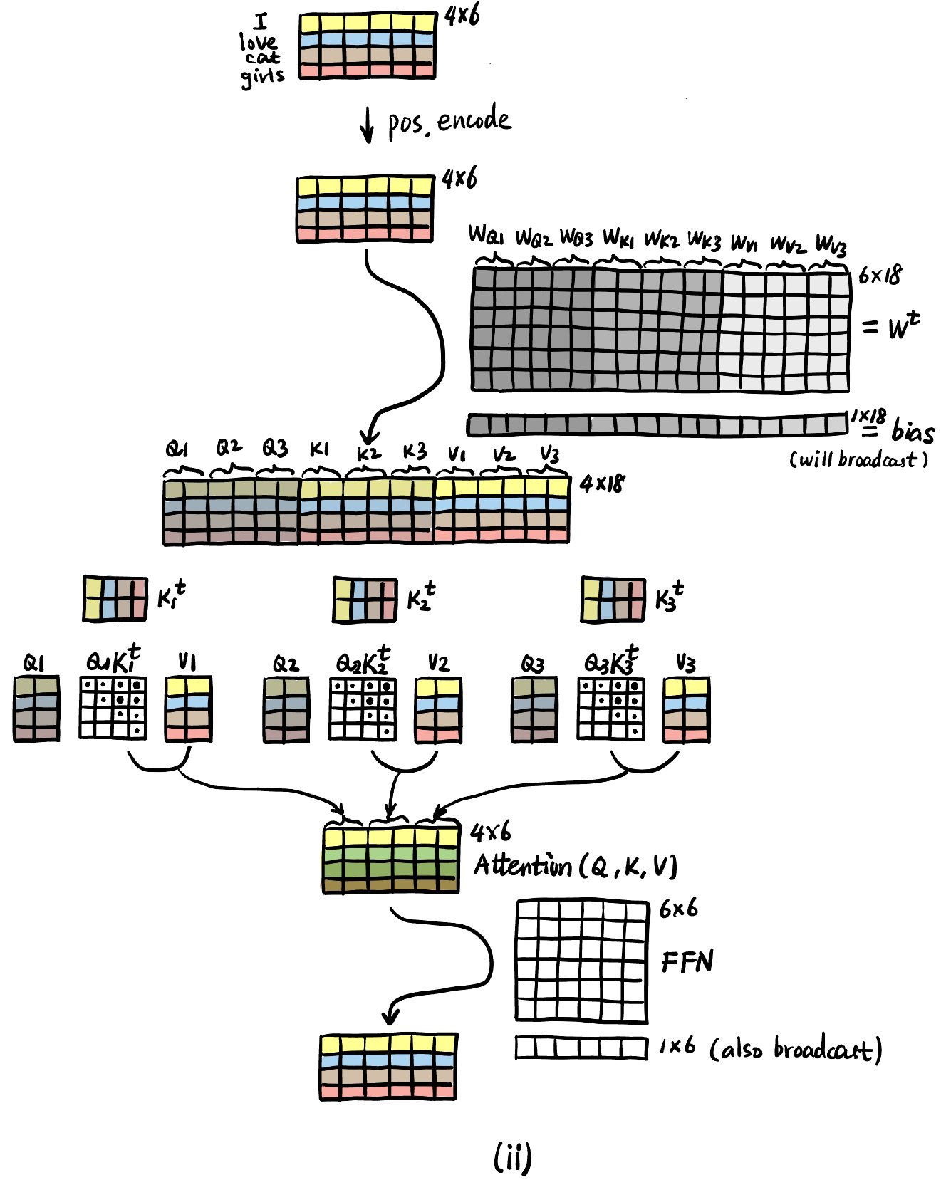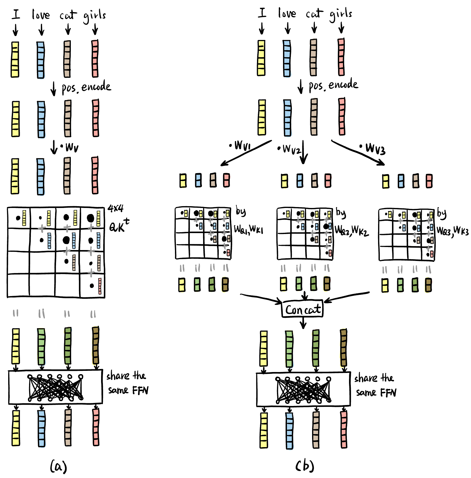 torch中自带的MultiheadAttention要求输入必须为NLE格式, 其中N是 batch (可以同时处理多个句子!),L是句子长度,E是 embedding 维度. 下面的例子由 Figure fig-mha-compute 诠释:t = torch.randn(1, 4, 6) attn = nn.MultiheadAttention(embed_dim=6, num_heads=3) output, _ = attn(t, t, t) # Self-attention print(output)