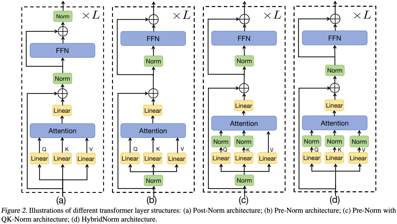 Figure 8: Norm 层可以放在重要的模块 (Attention/FFN) 前面 (Pre), 后面 (Post) 或混合来