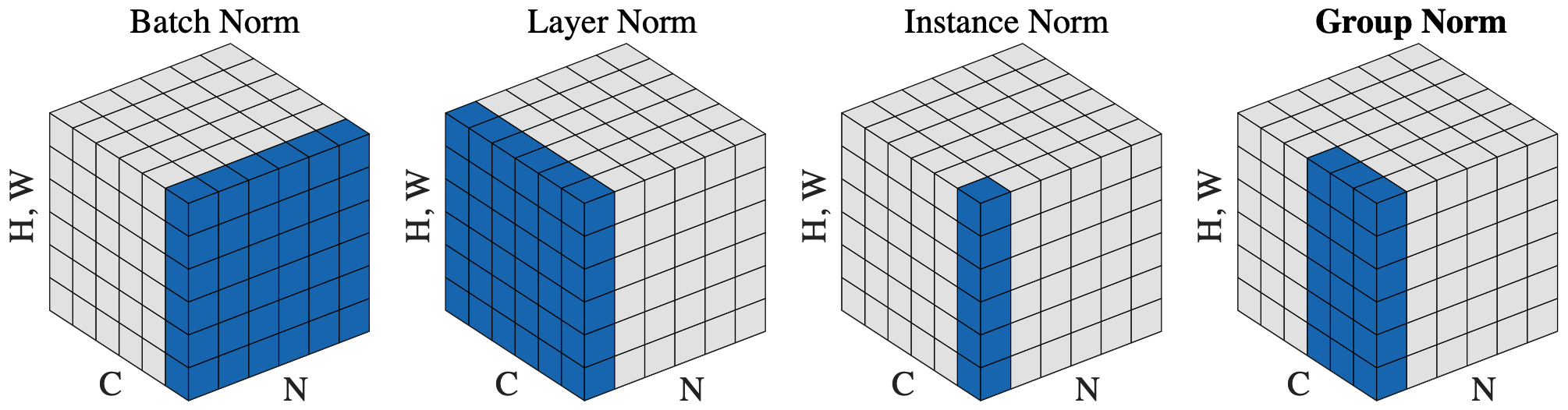 由于 Norm 层经常用于处理图片的 4 维张量 \([N,C,H,W]\) 2 (\([10, 3, 224, 224]\) 表示 \(10\) 张 \(224\times 224\) RGB 图片), 所以会用图片处理的维度来描述不同蓝色区域的选择, 分为: