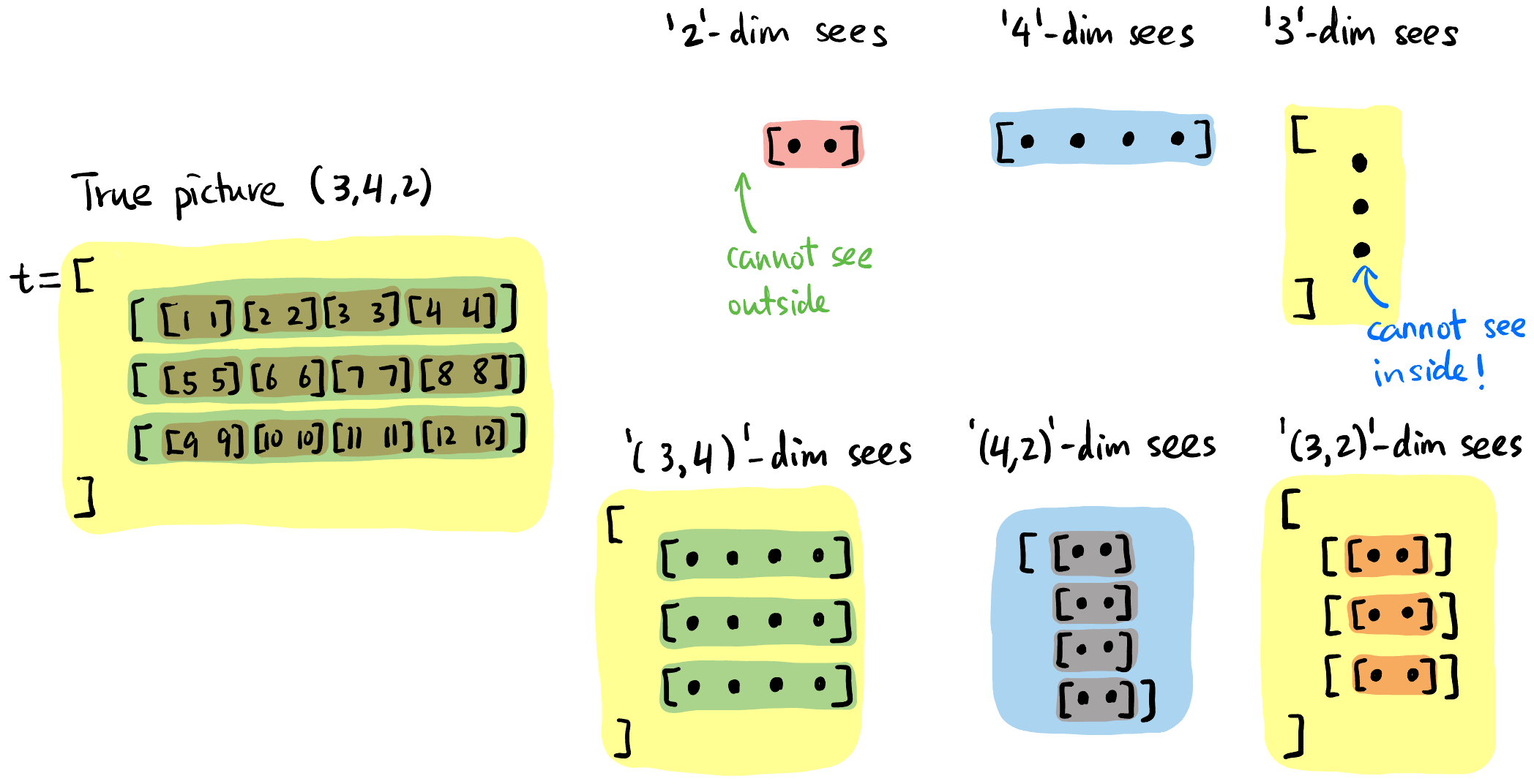 1,2,3地位相同,[1,2,3]和[4,5,6]地位相同.Tensor size: 笔者习惯从最内层中括号开始读起, 每层中括号相同地位的元素个数即为该维度的大小, 从右向左 列出来即为 tensor shape.