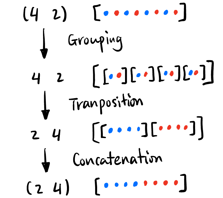 Figure 5: Tensor 变形的三个生成元. import torch from einops import rearrange t = torch.tensor([1,2,3,4,5,6,7,8]) t = rearrange(t, '(b a) -> b a', a=2) # Grouping, t.shape = [4,2], t = [[1,2],[3,4],[5,6],[7,8]] t = rearrange(t, 'b a -> a b') # Transposition, t.shape = [2,4], t = [[1,3,5,7],[2,4,6,8]] t = rearrage(t, 'b a -> (b a)', a=4) # Concatenation, t.shape = [8], t = [1,3,5,7,2,4,6,8]Transposition 操作也可以用: