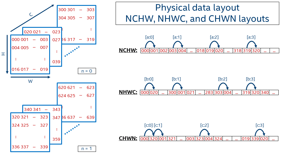 1 记忆方法: 反过来看, 如 NHWC, 先沿着 C 方向将数据拉直, 结束后跳到下一个 W, 然后换 H, 最后换 N.