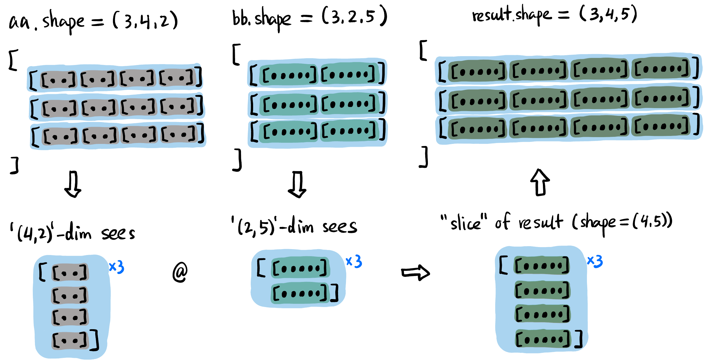 Figure 6: aa和bb矩阵乘法得到result的过程, 前面的维度 (3) 要求相同.思考张量矩阵乘法时将最后两维度的一个「切片」想象出来即可, 前面的维度只是这个过程的结构化重复