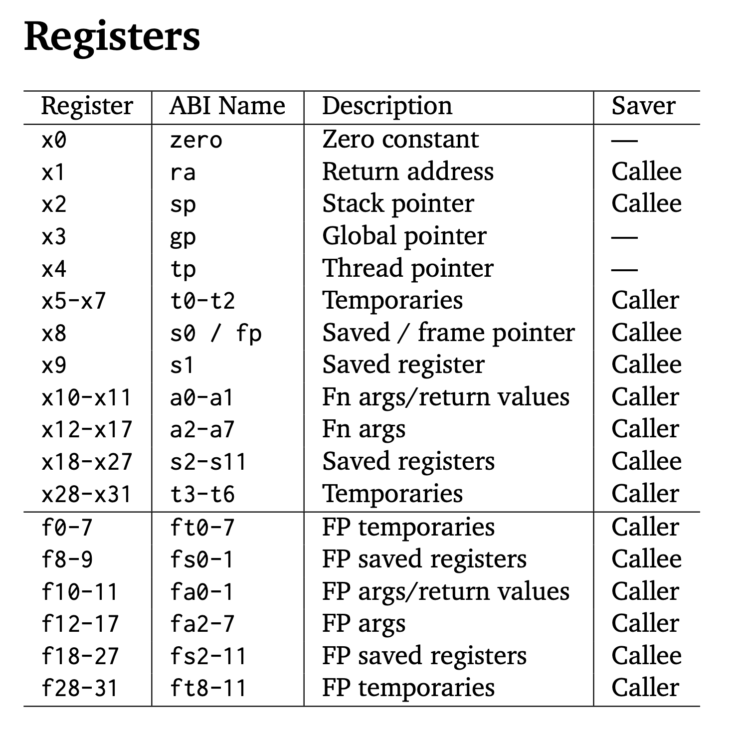 Each register has a conventional name that indicates its intended usage, although these names are just conventions, and you can use them for other purposes if needed.