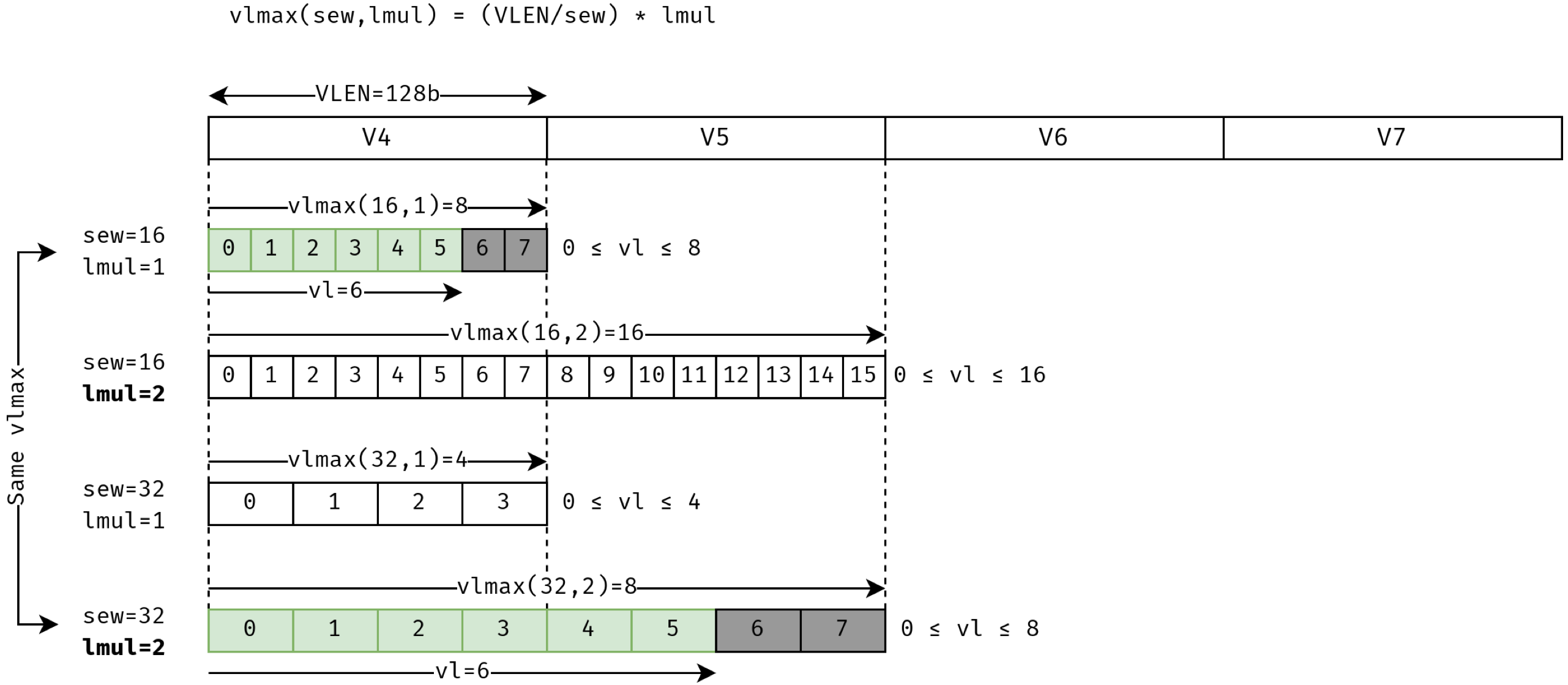 lmul(Length multiplier): 允许使用几个 RVV GPR.lmul=2记为m2.lmul\(>1\) 表示使用了一个 Vector Group.