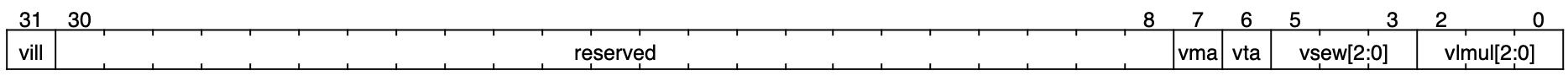 Figure 5: vtype寄存器只有低 \(8\) 位有用 [2]. 且直接对应 Figure fig-rvv-config 中vsetvl的rs2的所有 \(32\) 位、vsetvli和vsetivli指令的zimm低 \(8\) 位字段 (高位其实没有用).
